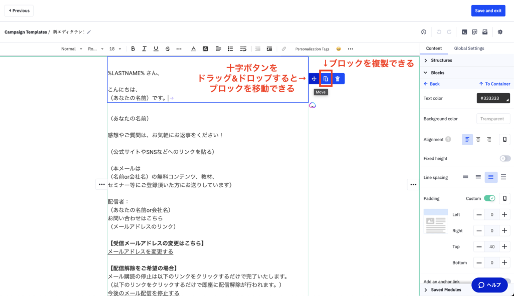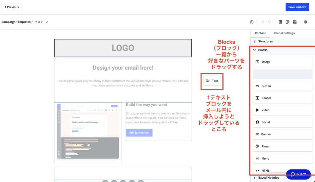 メールエディタの右側のContents(コンテンツ)メニュー内の「Blocks(ブロック一覧)」から好きなブロック(=パーツのこと)を選んで、左のメール編集画面にドラッグ&ドロップしていくことで、メールの土台を作成します。