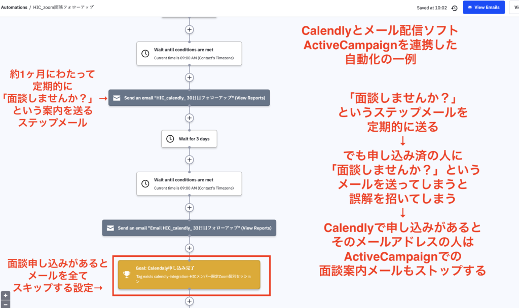 ・「面談予約完了」の「タグ」を付与されたら、ステップメールは一気に一番最後までスキップされ、ステップメールが終了する(ActiveCampaginのGoal(ゴール)機能を使ってメールをスキップしています)